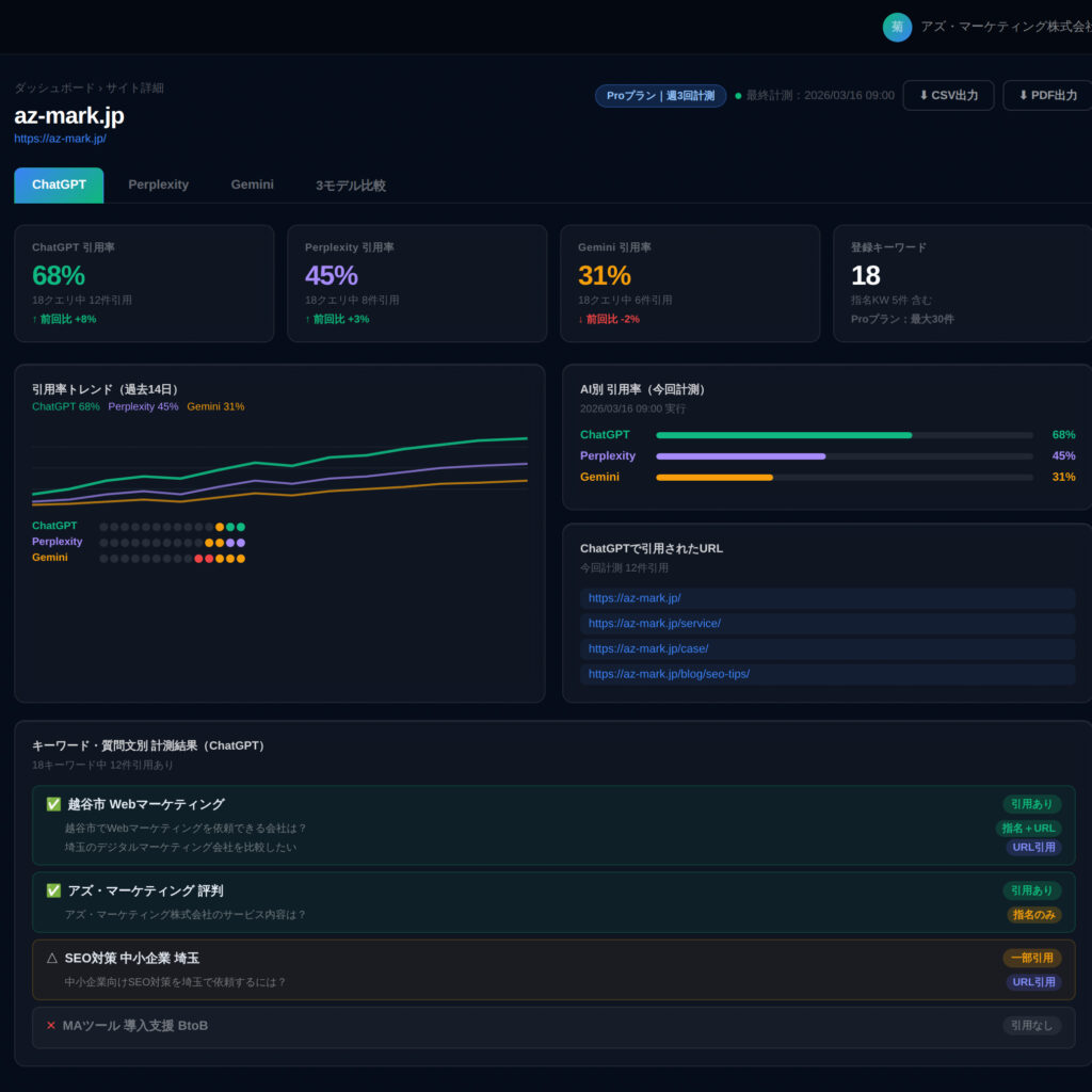 引用状況を「指名+URL引用」「指名のみ」「URL引用」「引用なし」の4パターンで分類し、ダッシュボードで継続的にトラッキングできます。AEO(Answer Engine Optimization/回答エンジン最適化)やLLMO(Large Language Model Optimization/生成AI最適化)対策の効果測定にご活用いただけます。 ChatGPT・Perplexity・Geminiへの質問を一括実行し、モデルごとの引用傾向を横断比較。AIごとに引用されやすいコンテンツの傾向を把握できます。 海外産ツールでは精度が落ちやすい日本語での計測に特化。「アズ・マーケティング」「アズマーケティング」「AZ Marketing」など、ブランド名の表記揺れにも対応し、サイテーション(言及・引用)を漏れなく検知します。 URLとサービス概要・ターゲット・競合情報を入力するだけで、「認知フェーズ」「検討フェーズ」「指名フェーズ」に沿った質問文(プロンプト)を自動生成。計測設計の専門知識がなくても、5分以内に計測をスタートできます。 計測結果はダッシュボードでの確認に加え、CSV・PDFでの出力にも対応。クライアントへの報告資料や社内共有に活用できます。 Freeプランは永久無料。有料プランも月額¥4,980〜と、海外ツールの1/4以下の価格で提供します。 ※年額契約で15%オフ。Starter以上は計測結果の履歴保持・CSV/PDF出力に対応。